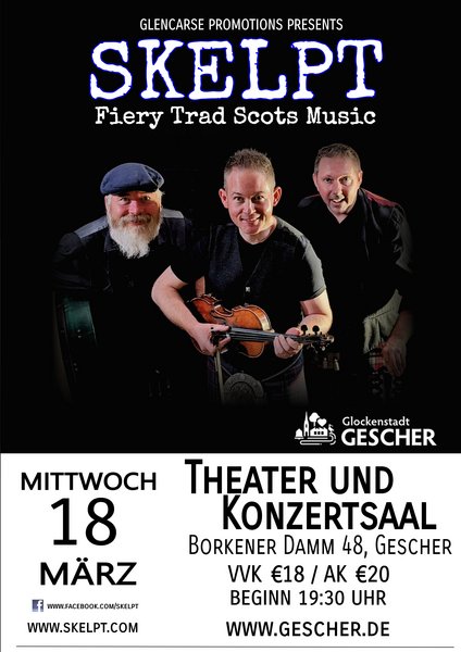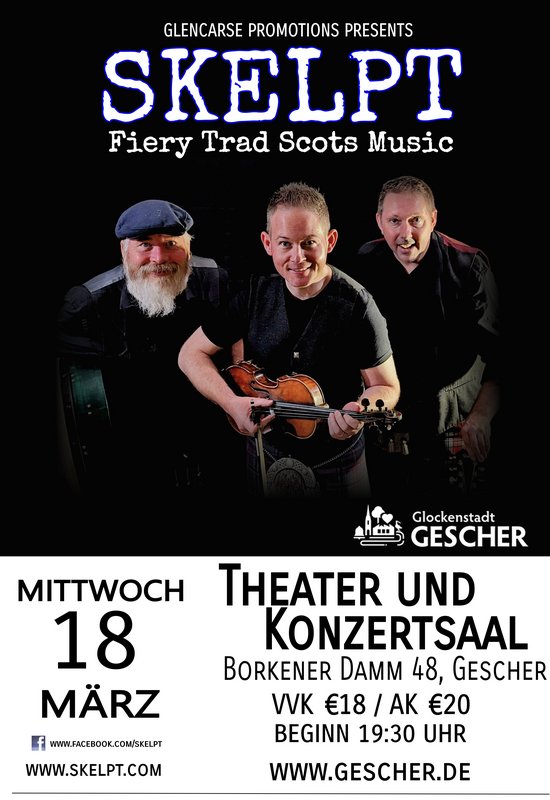 Skelpt spielt hauptsächlich in Schottland und ist für Veranstaltungen aller Art buchbar – von Festivals und Folk-Clubs über private Feiern bis hin zu Hochzeiten. Die Band tritt auch international auf, und Mitglieder sind regelmäßig in Deutschland, Norwegen, Dänemark und der Schweiz anzutreffen. Die Jungs sind aber auch bereit, weiter entfernte Orte zu bereisen. Wenn Sie also schottisches Flair und Energie für Ihre Veranstaltung suchen, melden Sie sich einfach bei Skelpt.