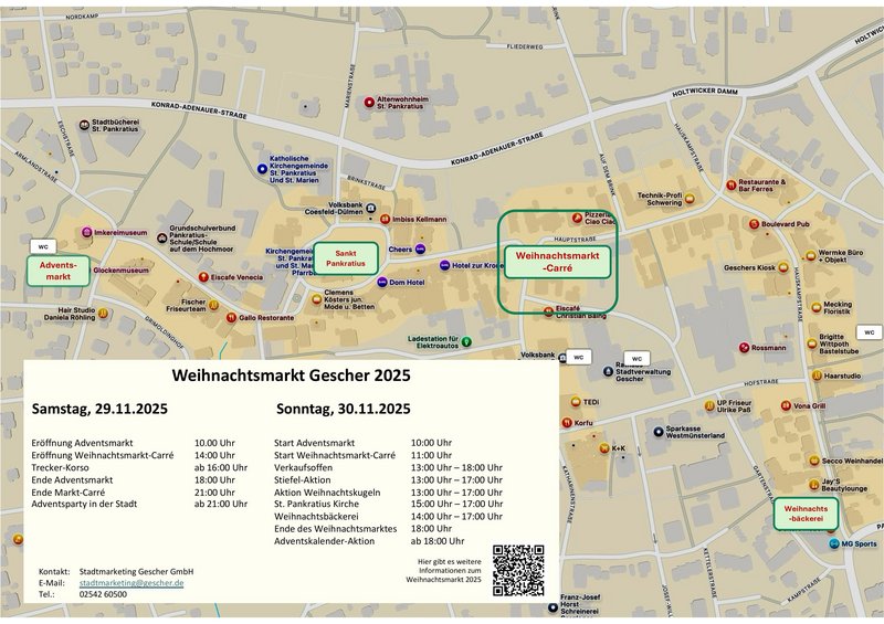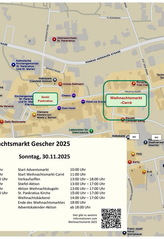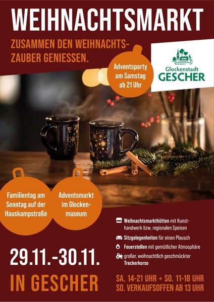 Weitere Stationen des Weihnachtsmarktes sind der Adventsmarkt im Glockenmuseum, der an beiden Tagen von 10.00 - 18.00 Uhr geöffnet hat. Der besinnliche Advent in der St. Pankratius-Kirche mit besonderen Klang - und Hörerlebnissen und die Familienmeile in der Hauskampstraße am Sonntag.